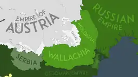 Under the Treaty of Adrianople, the Sultan reguaranteed the previously promised autonomy to Serbia, promised autonomy for Greece, and allowed Russia to occupy Moldavia and Wallachia until the Ottoman Empire had paid a large indemnity. However, under the modifications the later Treaty of Hünkâr İskelesi, these indemnities were sharply curtailed.[4] The treaty also fixed the border between the Ottoman Empire and Wallachia on the thalweg of the Danube, transferring to Wallachia the rule of the rayas of Turnu, Giurgiu and Brăila.[5][6]
