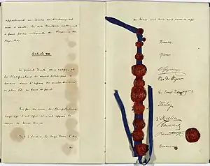 The Treaty of London (French: Traité de Londres), often called the Second Treaty of London after the 1839 Treaty, granted Luxembourg full independence and neutrality.[2] It was signed on 11 May 1867 in the aftermath of the Austro-Prussian War and the Luxembourg Crisis. It had wide-reaching consequences for Luxembourg and for relations among Europe's great powers.[3]