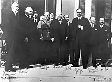 A delegation from the Kingdom of Serbs, Croats and Slovenes was dispatched to Santa Margherita Ligure, in Italy, for bilateral negotiations.[22] It was led by Vesnić, but the designated chief negotiatior was Trumbić. According to Svetozar Pribićević, this arrangement was made in Belgrade, in order to avoid the appearance that the Serbs were ceding to Italy territories inhabited by Croats and Slovenes. Therefore, Trumbić, as a Croat, would negotiate the treaty involving inevitable territorial concessions to Italy.[28] Sforza's most recent proposal was supported by the British and French, while the US remained silent on the matter, leaving Belgrade isolated.[24] In addition to Prime Minister Vesnić and Foreign Minister Trumbić, the Serbian ambassador to Rome Vojislav Antonijević was also among the principal members of that delegation. The principal members of the Italian negotiating team included Sforza, as well as Minister of War Ivanoe Bonomi and Giuseppe Volpi. Other members of the delegation included Marcello Roddolo, Francesco Salata, Alessandro Mattioli Pasqualini, and General Pietro Badoglio.[29] During the negotiations, Sforza demanded Istria and the Snežnik (Italian: Monte Nevoso), claiming their symbolic significance to Italy and stating that they would not be relinquished by the Italian army in any case. In return, he offered Italian friendship.[22] Negotiations took place on 9–11 November 1920, resulting in the treaty being signed on 12 November,[30] in the Villa Spinola. The treaty is named after the comune of Rapallo where the villa is located.[31] Italian Prime Minister Giovanni Giolitti came from Rome for the signing.[29]