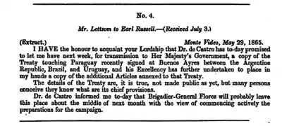 - ↑ See Lettsom to Russell, May 29, 1865, Hostilities in the River Plate, p.2: "The details of the Treaty are, it is true, not made public as yet, but many persons conceive they know what are its chief provisions."
