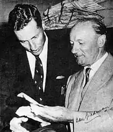 He suffered from severe sinusitis during the early part of the tour and spent time in hospital in Perth and Brisbane, where an operation after the First Test relieved the condition.[26] He scored 454 runs at 64.85 and took 11 wickets at 38.18 in the five Tests against Australia,[27] and led his young side to a one-all result with three Tests drawn. Sir Donald Bradman said he had "little doubt the South African side should have won the series" had they, and especially Goddard, had more confidence in their ability.[28] Wally Grout agreed, saying, "Time and time again in the series, when a little boldness would have carried them through, they chose caution."[29] Nevertheless, Goddard believed that, after the victory in the Fourth Test, "South Africa had at long last come out of its post-war chrysalis and had spread its wings as a Test-winning nation".[30]