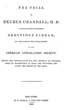 - ↑ "Trial of Reuben Crandall before the District Court of the City of Washington, on a charge of circulating Incendiary papers". Charleston Daily Courier (Charleston, South Carolina). May 5, 1836. p. 2. Archived from the original on September 2, 2020. Retrieved March 16, 2020 – via newspapers.com.