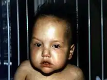 | Typical facial abnormalities with prominent forehead and cheeks, broad nasal root and wide-spaced eyes. Abnormal hairs are woolly, easily removed and poorly pigmented. | |