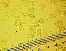 The spore print is white. Spores are elliptic (or narrowly so), and measure 8–12 by 4.8–6.2 µm. There are clamp connections present in the hyphae.[7] The basidia (spore-bearing cells) are four-spored, club-shaped, and measure 23–30 by 8–10 µm. The hymenium lacks cystidia. The cap flesh comprises homogenous, interwoven hyphae that are 3–5 µm in diameter, while the cap cuticle is a 200–300-micrometer thick layer of interwoven, gelatinous hyphae up to 4 µm in diameter.[2]
