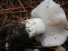 When collected in its typical habitat and during the appropriate season, Tricholoma vernaticum mushrooms can be readily identified because of their prominent characteristics: white color, stocky fruit body, farinaceous odor, and ring on the stipe. Tricholoma lookalikes in the same geographic region grow at lower elevations, typically in autumn. T. portentosum has a gray cap, a stipe with yellow tints, and lacks a ring, while T. mutabile has violet tones in its cap and also lacks a ring. Other lookalikes include Hygrophorus subalpinus and H. camarophyllus, but these species have broad, waxy gills, and lack the characteristic odor of T. vernaticum.[7]