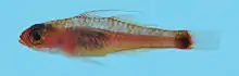 Trimma nasa, commonly called the nasal dwarfgoby or nasal pygmy goby, is a species of goby from the Western Pacific. They are small fish, averaging at around 2 cm (0.79 in) in length. They are bright orange and transparent yellow in life, with a white stripe running down from between the eyes to the upper lip and a dark brown spot at the base of the tail fin. They are usually found in large schools in the sloping or vertical drop-offs at coral reef edges.