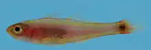 In life, the body is transparent yellow with bright orange abdominal cavity lining and iridescent blue and green highlights on the fins. There is a large dark brown spot at the base of the tail fin. There is usually a thin white stripe (dark in preserved specimens) on the snout, running from the upper lip to the area between the eyes. It overlies a rounded hump, also from the upper lip to just before the eye orbits. This is the source of their specific name, since it resembles the projecting bar of medieval nasal helmets.[5][6]