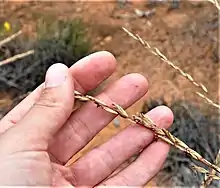 Triodia scariosa, is more commonly known as porcupine grass or spinifex (not to be confused with Spinifex spp.),[3] and belongs to the endemic Australian grass genus Triodia. [4] The species is perennial and evergreen and individuals grow in mounds, called hummocks, that reach up to ~1m in height.[5] The leaves are ~30 cm long, 1mm in diameter, needlepointed and rigid, and its inflorescence is a narrow, loose panicle that forms a flowering stalk up to ~2m in height.[6] The name is derived from Latin; Triodia refers to the three-toothed lobes of the lemma, and scariosa is in reference to the thin, dry glume. The species is common to Mallee (MVG14)[7] and Hummock grassland (MVG20)[8] communities, in arid and semi-arid regions of Australia.[5]