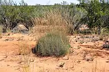 Vegetation species associated with T. scariosa are associated with its distribution within its range and the regions climate.[3][7] In the arid zone, it co-occurs with other Triodia species, and is also associated with Acacia, Corymbia, and Eucalyptus woodland.[3] In the southern aspect of its range, it is most commonly associated with an overstory dominated by Mallee Eucalypts (Eucalyptus dumosa and E. socialis),[17] but also Callitris, Melaleuca, Acacia and Hakea.[7] T. scariosa distribution is associated with soils that are low in available water and nutrients [21] and the extensive root system provides mechanical support for soils, reducing the loss of the thin aeolian topsoil layer.[5][21]