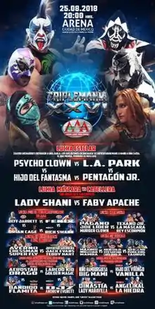 2018 marked the 26th year since 1993 that the Mexican professional wrestling company Lucha Libre AAA Worldwide (AAA) or Triple A held their annual Triplemanía show and the 31st Triplemanía show promoted by AAA, as they held multiple Triplemanía shows over the summers of 1994 to 1997. The 2018 event took place on August 25, 2018, at the Arena Ciudad de México (Mexico City Arena), an indoor arena in Azcapotzalco, Mexico City, Mexico that has a maximum capacity of 22,300 spectators.[1] This was the seventh consecutive Triplemanía (XX, XXI, XXII, XXIII, XXIV and XXV) held at the venue.[3][4][5] AAA's Triplemanía is their biggest show of the year, AAA's equivalent of the WWE's WrestleMania or New Japan Pro-Wrestling's Wrestle Kingdom event.