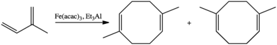 Fe(acac)3 has been examined as a precatalyst and reagent in organic chemistry, although the active iron-containing species is usually unidentified in these processes. In one instance, Fe(acac)3 was shown to promote cross-coupling a diene to an olefin.[5] Fe(acac)3 catalyzes the dimerization of isoprene to a mixture of 1,5-dimethyl-1,5-cyclooctadiene and 2,5-dimethyl-1,5-cyclooctadiene.[6]