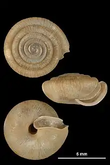 The shell is finely and regularly ribbed. It is strongly depressed on the upper side. The lower side is rounded. The shell has 5-6 whorls. The aperture has a characteristic shape. The lip is reflected and forms a "U" shape when seen from above. The umbilicus is deep and covers 1/7 of the shell diameter.[4]