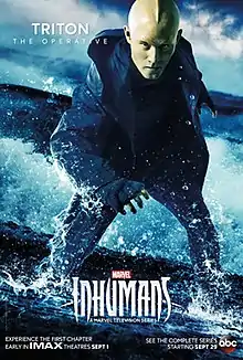 • Triton appears in the live-action Inhumans TV series, portrayed by Mike Moh.[44] In light of the Inhuman outbreak, Triton appears at the beginning of the episode "Behold... The Inhumans" where he attempts to rescue a newly transformed Inhuman girl with yellow eyes named Jane from military forces who are hunting her in Hawaii and secretly working for Maximus. The girl is killed while Triton is shot and falls into the ocean. This causes Gorgon to head to Hawaii to look for Triton where one attempt by him to search for Triton underwater led to Gorgon being saved by some passing surfers.[45] Triton returns alive and well in "Havoc in the Hidden Land" where it is revealed that he faked his injury as part of Black Bolt's plan to draw out Maximus. Following Gorgon's death and the apprehension of the Inhumans recruited by Maximus, Triton arrives at the beach in the area where he is to meet up with Black Bolt after laying low. Afterwards, he returns to Attilan where he and the Inhuman Royal Family plan to take back the throne from Maximus. After defeating some Inhuman Royal Guard members that are on Maximus' side, Triton is tasked with capturing Maximus and brings him back to Black Bolt after defeating him in combat where Maximus reveals the failsafe of Attilan that he caused.[46] He aids his family with evacuating the citizens of Attilan and finally leaves himself through Lockjaw. Triton is last seen with the evacuated Inhumans as Medusa gives a speech about them finding a new home on Earth.[47]