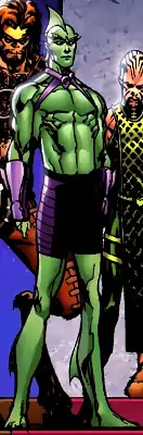 Triton later met the Sub-Mariner, and then battled Plantman's Leviathan.[9] He aided the Inhuman Royal Family in defeating Maximus's attempt to overthrow the Great Refuge.[10] He then singlehandedly captured Maximus,[11] and battled the Mandarin alongside the Royal Family.[12] He traveled to New York to warn the Avengers of the Inhumans' involvement in the Kree-Skrull War.[13]