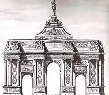 The triumphal arch project holds a special place in France's cultural history, as it was the starting point of a public controversy known as the Quarrel of Inscriptions (French: querelle des inscriptions), itself a significant episode of the broader Quarrel of the Ancients and the Moderns that reached its climax a decade later with the production by Charles Perrault, Claude's brother, of his essay on the era of Louis XIV (French: Le Siècle de Louis le Grand). The initial question was whether the inscriptions glorifying Louis on the projected arch should be in ("ancient") Latin or ("modern") French. Antiquarian François Charpentier argued in favor of French inscriptions, and was countered by Jesuit Jean Lucas of the College de Clermont,[2] who defended the option of Latin in an eloquent address pronounced at the College on 25 November 1676 that was published in 1677 under the title De Monumentis Publicis Latine Inscribendis Oratio.[3]
