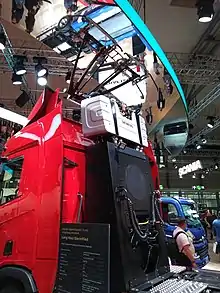 A trolleytruck (also known as a freight trolley or trolley truck[1]) is a trolleybus-like vehicle used for carrying cargo instead of passengers. A trolleytruck is usually a type of electric truck powered by two overhead wires, from which it draws electricity using two trolley poles. Two current collectors are required in order to supply and return current, because the return current cannot pass to the ground (as is done by streetcars on rails[2]) since trolleytrucks use tires that are insulators. Lower powered trucks, such as might be seen on the streets of a city, tend to use trolley poles for current collection. Higher powered trucks, such as those used for large construction or mining projects, may exceed the power capacity of trolley poles and have to use pantographs instead.[3][4] Trolleytrucks have been used in various places around the world and are still in use in cities in Russia and Ukraine, as well as at mines in North America and Africa. Because they draw power from the mains, trolleytrucks can use renewable energy sources – modern trolleytrucks systems are under test in Sweden and Germany along highways using diesel–electric hybrids to reduce emissions.