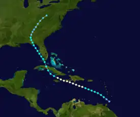 A tropical wave developed into a tropical depression near Tobago on August 7.[3] The system then passed through the Windward Islands just south of Carriacou and Petite Martinique. Upon entering the Caribbean Sea early on August 8, the tropical depression strengthened into a tropical storm. On August 9, the storm strengthened to the equivalent of a Category 1 hurricane, while positioned south of Dominican Republic. The next day, the hurricane peaked with winds of 90 mph (140 km/h). After striking the Tiburon Peninsula of Haiti, the cyclone began weakening and fell to tropical storm intensity on August 12. By midday on the following day, the storm made landfall near Cienfuegos, Cuba. Upon emerging into the Straits of Florida, the storm began to re-strengthen. Early on August 13, it struck Big Pine Key, Florida, as a strong tropical storm. Weakening slowly while moving north-northwestward, the system made another landfall near St. George Island. After moving inland, the tropical storm slowly deteriorated, falling to tropical depression intensity on August 15 and dissipating over West Virginia on August 17.[4]