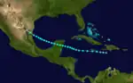 A tropical storm formed on September 1 just south of Hispaniola. Moving just north of due west, the system brushed the south coast of Jamaica as a 40 mph (64 km/h) tropical storm on September 2 before slowly beginning to intensify on September 3. The strengthening tropical storm reached its peak of 60 mph (97 km/h) on September 4 shortly before making landfall on the Yucatan Peninsula near Playa del Carmen near its peak intensity early on September 5. The system deteriorated after crossing the peninsula and entering the Bay of Campeche early on September 6 as a weak tropical storm. Later, the storm restrengthened slightly to winds of 50 mph (80 km/h) while nearing mainland Mexico on September 7. The tropical storm then weakened slightly shortly before making landfall north of Tampico early on September 8 as a weak 40 mph (64 km/h) tropical storm. After moving inland, the system weakened quickly to a depression and dissipated.[4] The storm brought 2.18 in (55 mm) of rain to Brownsville, Texas.[18]