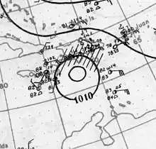 In its early developmental stages north of the Greater Antilles, the storm disrupted shipping routes through the Bahamas and generated rough seas offshore Cuba.[5][6] At its first landfall on Fort Pierce, the hurricane caused property damage in several areas, particularly in coastal regions, where numerous homes were unroofed.[7] Central Florida's citrus crop was hampered by the strong winds and heavy rain.[3] Several of Florida's lakes, including Lake Okeechobee, rose past their banks, inundating coastal areas.[8][9] Damage to infrastructure was less in inland regions than at the coast, though power outages caused a widespread loss of communication.[10] At the hurricane's second landfall, wind damage was relatively minor, though torrential rainfall, aided by orthographic lift, caused extensive flooding as far north as the Mid-Atlantic states.[11] Overall, the hurricane caused $235,000 in damages, primarily in Florida, and two deaths.[3]