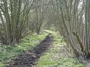Diesel railbus services were introduced by British Railways Western Region on the Tetbury branch line on 2 February 1959, and on the same day two halts were opened on that line, at Church's Hill and at Trouble House.[1][2] It was built to serve a 17th-century public house, the Trouble House Inn, which had originally called the Waggon and Horses, but was later renamed because it had been built on flood-prone land known as "The Troubles" and also for the difficulties which beset a series of innkeepers in the 18th and 19th centuries, including being taken by a press gang.[3] It was the only station in England built specifically to serve a pub, although Berney Arms station in Norfolk has much the same function.
