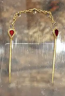 The occupant of the grave was a young woman, aged about 16, who was buried lying on a wooden bed (now decayed, but identifiable from its iron brackets). She was buried with a number of grave goods, including an iron knife, a chatelaine, and some glass beads that perhaps originally decorated a purse. Most notably, an ornate gold pectoral cross was found on her breast. The small cross, only 3.5 cm across, is inlaid with garnets, and would have been sewn onto the robe that she was wearing, as indicated by loops on the back of each arm of the cross.[1][2][3]