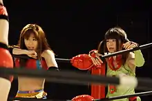 Before leaving Ice Ribbon, Toyota suggested that Tsukushi should form a new tag team with Tsukasa Fujimoto; the two followed the suggestion and dubbed their new team "Dropkickers".[43] On October 15, Dropkickers wrestled Chisako and Sachiko to a twenty-minute time limit draw; as a result, the title was once again declared vacant.[44] The following day, Tsukushi defeated Riho to earn the right to represent Ice Ribbon at Sendai Girls' Joshi Puroresu Dantai Taikou Flash tournament, a single-elimination tournament, where different joshi promotions battled each other.[45] On October 27, Team Ice Ribbon (Tsukushi, Emi Sakura, Hikari Minami, Hikaru Shida and Tsukasa Fujimoto) was eliminated from the tournament in the first round by Team Sendai Girls' (Meiko Satomura, Dash Chisako, Kagetsu, Miyako Morino and Sendai Sachiko), when Tsukushi was pinned by Chisako.[46][47] On December 2, Tsukushi defeated Kurumi to regain the IW19 Championship.[48] The rivalry between Ice Ribbon and Sendai Girls' culminated on December 25 at RibbonMania 2011, where Tsukushi and Emi Sakura faced Meiko Satomura and Sendai Sachiko in a match for the vacant International Ribbon Tag Team Championship. Tsukushi won the match for her team and Ice Ribbon by pinning Sachiko, thus winning the International Ribbon Tag Team Championship for the first time.[49] However, as Sakura had announced just prior to the match that she would be leaving Ice Ribbon the following month, her and Tsukushi's reign lasted only three days before they lost the title to Hikaru Shida and Maki Narumiya.[50] On January 7, 2012, Tsukushi defeated Sakura in her Ice Ribbon farewell match.[51]