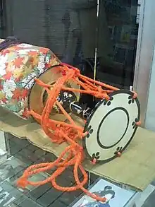 The tsudzumi (鼓) or tsuzumi is a hand drum of Japanese origin.[1] It consists of a wooden body shaped like an hourglass, and it is taut, with two drum heads with cords that can be squeezed or released to increase or decrease the tension of the heads respectively. This mechanism allows the player to raise or lower the pitch of the drum while playing, not unlike the African talking drum and the Indian dhadd.