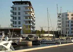 Tuborg Havn or Port of Tuborg is a marina and surrounding mixed-use neighbourhood in the Hellerup district of Copenhagen, Denmark. Located on a peninsula on the north side of Svanemølle Bay, just north of the border to Copenhagen Municipality, it is the result of a redevelopment of the former industrial site of Tuborg Breweries which ceased operations in 1996. The marina is operated by the Royal Danish Yacht Club (KDY) which also has their club house at the site. Other local landmarks include the Experimentarium science centre, the Waterfront shopping centre and the Saxo Bank headquarters. The port is located a 15-minute walk from the S-trains stations Svanemøllen (south) or Hellerup (north).