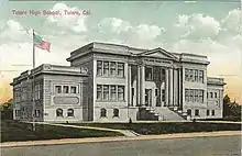 The original Tulare school was established in 1873 in a two-room school building. On May 4, 1884, a new two-story brick building was built with nine classrooms and offices on the site of the first building. It was located on 400 block of West Tulare Avenue. In 1890, the school district decided to use the second story for high school students. In June 1893, the high school had its first graduation class of eleven students. In 1908, the high school moved into a new building constructed on property owned by D. W. Madden. The school reopened for students in 1909. This was a three-story brick building with an auditorium that seated 600 students.[5]