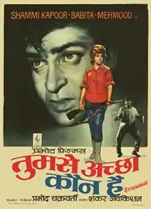 Tumse Achha Kaun Hai (transl. Who is better than you) is a 1969 Romantic-Comedy Drama Indian film, written by Sachin Bhowmick and produced-directed by Pramod Chakravorty. The film starred Shammi Kapoor, Babita, Mehmood, Lalita Pawar and Pran. The music was composed by the duo Shankar Jaikishan and song lyrics written by Hasrat Jaipuri.[1]