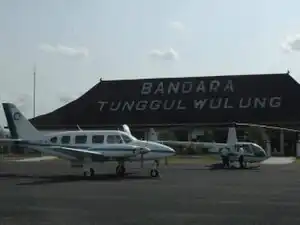 Tunggul Wulung Airport (IATA: CXP, ICAO: WAHL) is an airport which currently serves the city of Cilacap in Central Java, Indonesia. It is located 9 km from the city downtown. There is a small terminal with the large airport name. The airport has one runway, with dimensions of 1,400 metres (4,593 ft) by 30 metres (98 ft) which allows the operation of aircraft up to ATR 72-600.