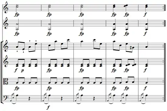 Both characteristics just mentioned can be seen in the following extract of Turkish music in the Mozart's Violin Concerto No. 5: