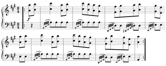 • The Piano Sonata in A, K. 331 (1783) ends with the famous rondo marked "Alla Turca". Repeated notes, repeated ornaments, and loud/soft passages are characteristic of the Turkish style. The imitation probably came closer with the piano of Mozart's day, whose bass strings made something of a rattle when played loudly, than is possible on modern pianos.