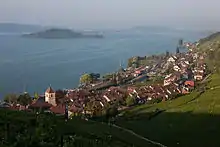 Twann village with Lake Biel/Bienne and St. Peter's Island in background