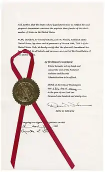On May 19, 1992, the Twenty-seventh Amendment's certificate of ratification, signed by the Archivist of the United States, Don W. Wilson, on May 18, 1992, was printed and published in the Federal Register.[35]
