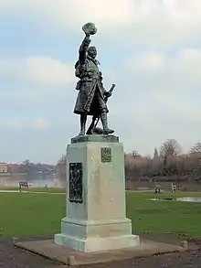 The memorial represents a life-size soldier, cast in bronze by the Singer & Sons foundry.[12] The figure is depicted walking in service dress and greatcoat, holding a rifle in one hand, with the other hand lifting up a cap to wave above his head. The statue is unusual for showing a "joyful returning soldier, in contrast to the more conventional attitudes of watchfulness or mourning".[10] The Cambridge War Memorial has a similar composition of a soldier marching home cheerfully holding a helmet, and the Lancashire Fusiliers Boer War Memorial in Bury, Greater Manchester, is an earlier example of a memorial sculpture of a soldier holding aloft his headgear in celebration. (Both are listed at Grade II.)