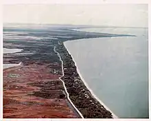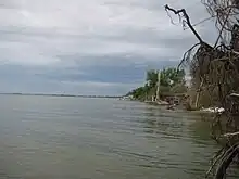 The history of Twin Lakes Beach as a recreational area began around 1911 when Meindl built a hunting lodge, as hunting was the primary activity of the beach at the time.[3] The lodge and others over time were used in the summer for fishing and holidays as well. About six or seven other medical doctors also used the area for hunting including Howden and Lambert. Over time Howden and Meindl acquired the land that comprises most of the present day beach from a local farmer with Howden acquiring over one mile of land in the Rural Municipality of Woodlands while Meindl acquired approximately 3 miles of land in the Rural Municipality of St. Laurent.[3] It was after this time that the land was subdivided and many people began to purchase lakefront properties in the area initially mainly for summer homes and cottages, but also for permanent residences later on. Meindl donated 580 feet of beach front land for the local Metis people of St. Laurent for recreational use, which later became Meindl Park (French: Parc Meindl), named in his honour.[4] Prior to the flooding of 2011, the highest recorded water level on Lake Manitoba was during the summer of 1955 when the water level gauge at nearby Delta Beach recorded 816.32 feet above sea level, although the readings were subject to wind setup due to the long fetch length of the lake to the north.[5] During this year some residents were forced to boat to their properties as the road was underwater.
