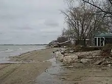 Twin Lakes Beach has been the recipient of many storms causing shoreline erosion, flooding and property damage. Most notably are the storms of the fall of 1999, especially the storm on November 1 , as well as the fall of 2010 "weather bomb" both of which involved wind gusts of over 100 km/h and high winds for an extended period of time with the result being a shift in the lake of water from the north basin of Lake Manitoba to the south basin of the lake and large waves. Both storms resulted in considerable shoreline erosion, property damage, and some flooding. The 1999 storm caused an estimated $1 million in damage and was a catalyst for establishing new regulation of lake levels.[5] Also in 1981 and 1992 cottages were destroyed as a result of shoreline ice pile-up. On July 29, 2012 a thunderstorm occurred at Twin Lakes Beach causing widespread damage to property including complete destruction of homes due to heavy rain, hail, and plow winds with gusts up to 150 km/h recorded on radar.[16][17]