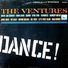 Twist with the Ventures is the fifth studio album by the band The Ventures; released in 1962 on Dolton Records BST 8010 (stereo) and BLP 2010 (monaural).[1] It consists mostly of instrumental versions of popular dance tunes from the late 1950s to early 1960s, with a couple of original compositions. It was on the charts for 29 weeks and it peaked at # 24 on the Billboard 200.[2] It was later retitled Dance! with new album cover.[1] During the recording of this album, original drummer Howie Johnson left the band and was replaced by Mel Taylor, thus forming the classic Ventures lineup.[3] Therefore, the drum credit(s) are shared on this album between both Johnson and Taylor.