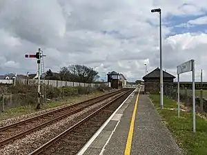 The station is unmanned and has no ticketing provision – all tickets must be bought in advance or on the train. The station buildings still stand and are now used as a private residence;[2] basic waiting shelters are provided for passenger use on each side. Digital display screens, timetable posters and a telephone provide train running information. Step-free access is available to both platforms via ramps from the road that crosses the line here, though the gradient on both makes the station unsuitable for wheelchair users.[3]