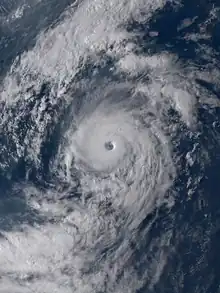 While the typhoon was moving westward toward the Philippine island of Luzon, thunderstorms in the northern eyewall deteriorated as a result of unfavorable subsidence from a high pressure system to the north.[11][12] Early on August 18, the Philippine warning center PAGASA began national advisories on the typhoon, giving Goni the local name Ineng.[13] On the next day, the typhoon rounded the subtropical ridge, co-existing with Typhoon Atsani, which developed concurrently over the western Pacific Ocean to the east.[14][15] On August 21, Goni's movement became nearly stationary about 100 km (62 mi) off the northern coast of Luzon. Land interaction weakened the typhoon's convective core until a building ridge to the southeast drove Goni northeastward and allowed convection to redevelop.[3][16][17] A new eye developed on August 23 as Goni passed east of Taiwan. The eye crossed over Iriomote-jima and Ishigaki, both part of the southern Ryukyu Islands.[18][19] Late on August 23, Goni attained its peak intensity with JMA-estimated peak winds of 185 km/h (115 mph).[3]