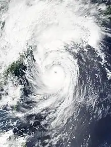 On August 23, Typhoon Goni passed over Iriomote-jima and Ishigaki.[19] A station on the latter island recorded four hours of typhoon conditions, peaking with sustained winds of 162 km/h (101 mph) and gusts as high as 256 km/h (159 mph).[20][55] The winds damaged buildings and upended vehicles.[55] Five people were lacerated by broken glass on Ishigaki Island.[29][30] Across the southern Ryukyu Islands, the typhoon cut power to 21,400 houses.[29] Agricultural losses in Okinawa were estimated at ¥782 million (US$6.51 million).[56]