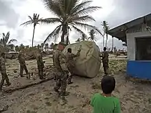 The damage assessment took place from March 18 to April 4, with assistance from the IOM. It found along with infrastructure damage, that agriculture production was damaged across 30 islands, leaving 11,575 people food insecure. Shipments containing rice, vegetables, and cooking oil were sent to the Mortlock Islands of Chuuk State. Approximately $450,000 from USAID's Office of Foreign Disaster Assistance, New Zealand Embassy, and Australian Aid, was mobilized to contribute efforts and for purchasing food baskets, aiding 9,295 people and an additional 2,280 who suffered moderate crop damage.[63] On March 31, a multinational team aboard USNS Brunswick arrived at the Lower Mortlock Islands to support recovery efforts as part of Pacific Partnership 2019.[64] Because of their Compact of Free Association between the national governments, U.S. President Donald Trump declared Wutip a disaster on May 7, and made funding for emergency relief and reconstruction assistance available, after Christian had requested a disaster declaration on April 17.[65] With this funding, the Catholic Relief Services provided agricultural rehabilitation, and the IOM gave food assistance for the areas affected by Wutip. The USAID division in the Philippines reconstructed 136 homes and 39 public structures. Relief and reconstruction funding from USAID totaled more than $22.3 million.[62]