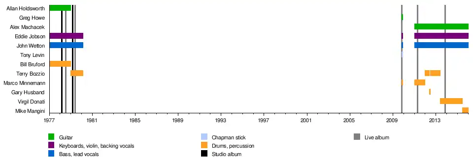 Bruford and Wetton next approached Robert Fripp to reform King Crimson.[3] When Fripp eventually declined, Bruford and Wetton decided that each would choose a musician in order to form a new band. Wetton brought in Eddie Jobson, who since leaving Roxy Music in 1976 had joined Frank Zappa's band, thus "stealing" him from Zappa.[4] Bruford recruited Allan Holdsworth (formerly of Soft Machine, Nucleus, Gong, Tempest and The Tony Williams Lifetime) who had played on Bruford's debut solo album, Feels Good to Me (1978).