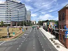 US 13 Bus. heads into downtown Wilmington and crosses under Amtrak's Northeast Corridor railroad line at Wilmington station that serves Amtrak and SEPTA's Wilmington/Newark Line. Immediately after, the business route intersects the eastern terminus of Delaware Route 48 (DE 48), which follows Martin Luther King Jr. Boulevard/Front Street eastbound and 2nd Street westbound, while the northbound direction passes west of the Wilmington Transit Center serving DART First State busses. At this point, US 13 Bus. continues north to follow North Walnut Street northbound and North King Street southbound, with four northbound lanes and three southbound lanes. The road passes downtown businesses and intersects DE 9 (4th Street) south of the Leonard L. Williams Justice Center (the county courthouse for New Castle County). Continuing through the downtown, the business route carries three lanes in each direction and runs near high-rise buildings, with southbound US 13 Bus. passing to the east of Delaware College of Art and Design north of 6th Street. Further north, the southbound direction passes east of Rodney Square between 10th and 11th streets before the route comes to a junction with the southern terminus of DE 52, which follows 11th Street eastbound (southbound) and 12th Street westbound (northbound). At the north end of downtown, northbound US 13 Bus. turns west on 16th Street to rejoin the southbound direction.[3][4]