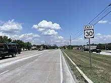 US 30 gains a center left-turn lane before it leaves Irwin and becomes a four-lane divided highway as it comes to the Irwin interchange with the Pennsylvania Turnpike (I-76). Past this interchange, the median turns into a center left-turn lane.[2][3]