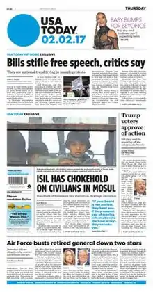 USA Today (often stylized in all caps[5]) is an American daily middle-market newspaper and news broadcasting company. Founded by Al Neuharth on September 15, 1982, the newspaper operates from Gannett's corporate headquarters in Tysons, Virginia.[6] Its newspaper is printed at 37 sites across the United States and at five additional sites internationally. The paper's dynamic design influenced the style of local, regional, and national newspapers worldwide through its use of concise reports, colorized images, informational graphics, and inclusion of popular culture stories, among other distinct features.[7][8]