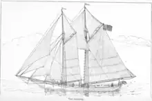 In addition to meeting the Fish Commission's research and fish culture requirements, Grampus's design also reflected ideas for improvement in the design of the then-conventional New England commercial fishing schooners so as to improve both speed and safety.[4] In the mid-1880s, these schooners tended to be wide, shallow, and sharp so as to allow the greatest possible speed by reducing drag through the water and allowing the ship to carry a considerable amount of sail. In order to keep the hulls shallow, the schooners were "very wide aft, with a heavy, clumsy stern and fat counters, the run being hollowed out excessively so as to produce in the after section a series of very abrupt horizontal curves."[4] The two masts came to nearly the same height above the waterline, and the schooners carried a large jib extending from the bowsprit end to the foremast.[4]
