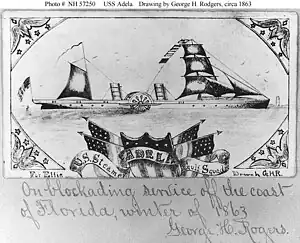 USS Adela (1863–1865) Drawing by George H. Rogers, depicting the ship "on blockading service off the coast of Florida, winter of 1863". The artist served on board Adela as a Pharmacist's Mate.