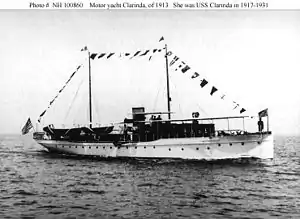 Clarinda was built in 1913 by the Matthews Boat Company at Port Clinton, Ohio,[3] as a civilian twin-screw motor yacht of the same name. The U.S. Navy purchased her on 5 July 1917 for World War I service as a patrol vessel. She was commissioned as USS Clarinda (SP-185) on 21 November 1917.